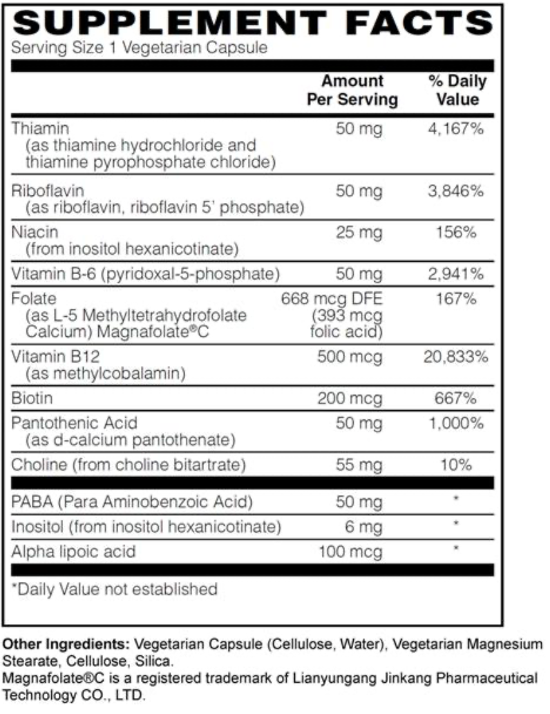 A comprehensive Coenzyme Methylated B Complex with coenzyme B vitamins, Methyl Folate and Methylcobalamin. In addition, we added Choline and Lipoic Acid. Coenzyme and Methylated B vitamins have a direct impact on metabolism, as well as supporting detoxification of hormonal pathways. They also aid the absorption of other nutrients. Those with the MTHFR enzyme polymorphism do not convert these much-needed B Vitamins into their active form. The methylation of B vitamins is important to the proper function of the endocrine system, metabolism, and the circulatory system. This formula supports a healthy stress response, normal detoxification, a healthy inflammation response, energy production, and homocysteine production. This is why a methyl B vitamin complex is a regular part of many people’s daily supplement routine. ‡